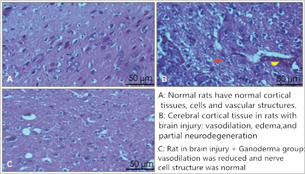 In addition, slices of cortical tissue also show that Ganoderma lucidum polysaccharides can improve vasodilation and edema, repair nerve cells, and accelerate the recovery of the injured brain (as shown below).