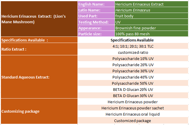 Supported Purity: Polysaccharide10%~50%,4:1~30:1, Hericenones 2% ;Hericium 1% & OEM service