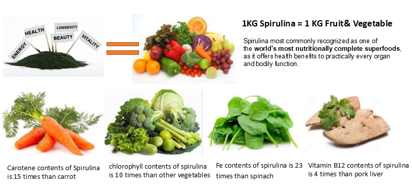 and minerals in Spirulina can be absorbed into blood stream 4-6 times than that of Iron found in meat.